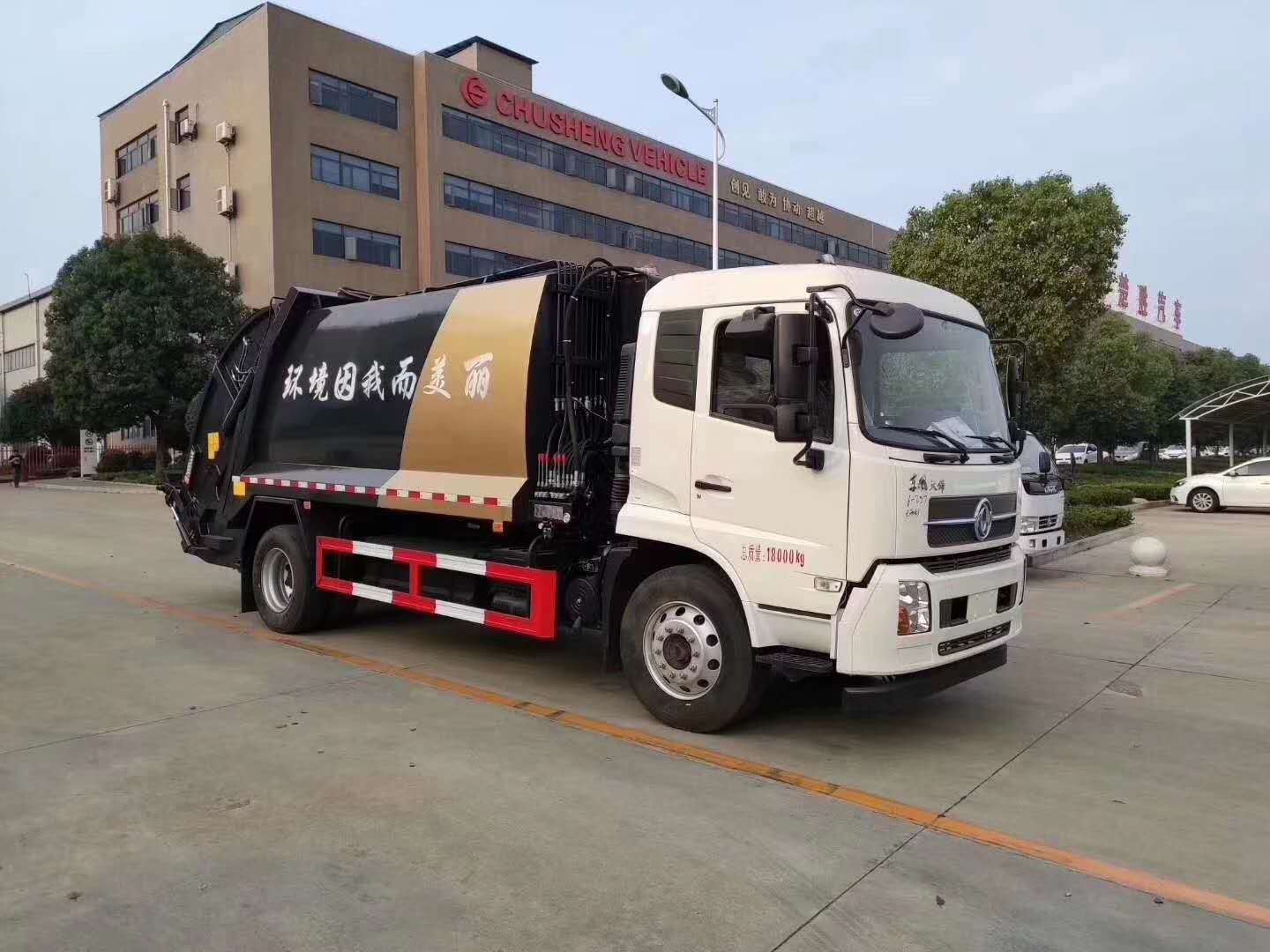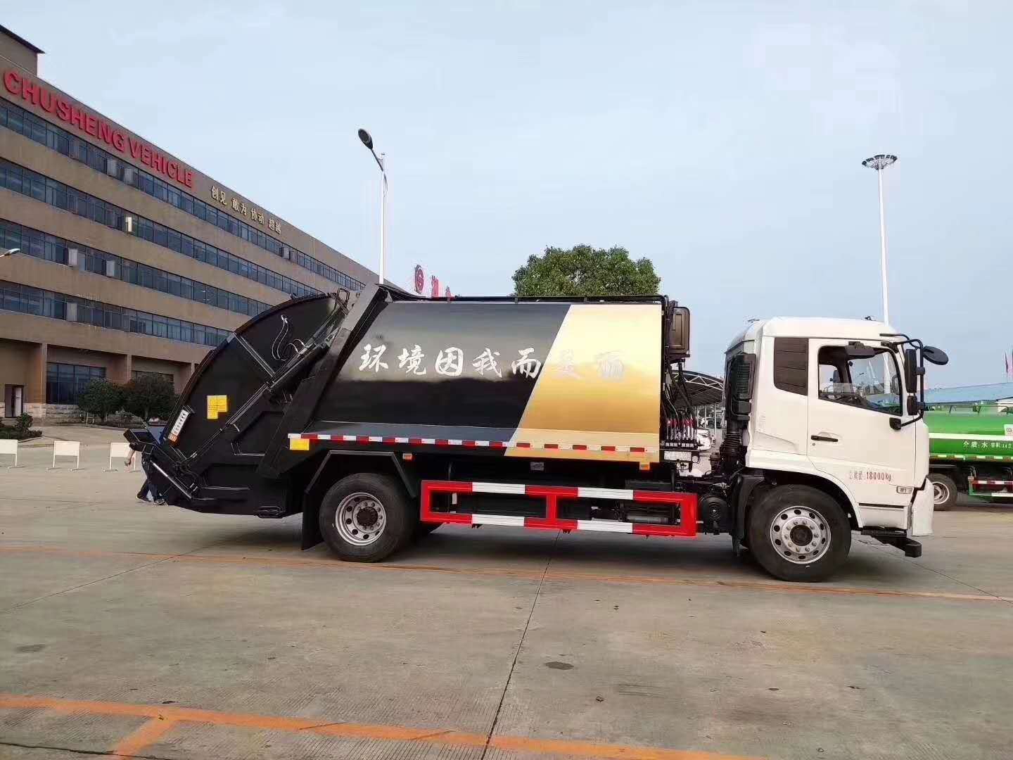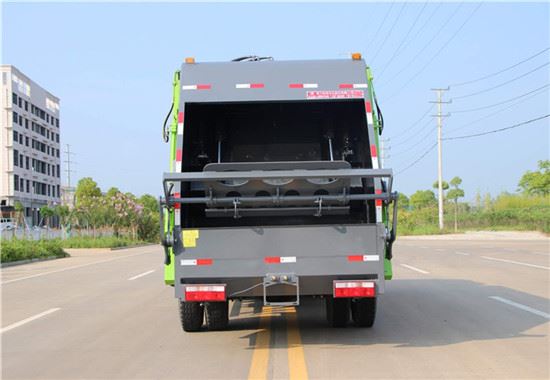 上装配置:12立方的压缩垃圾箱体,常配:为前推后压,带副压板,污水箱,电控操作。压缩垃圾箱为联体式,外接电源工作,翻转进料,箱内带压缩推板,后部带锁紧门。