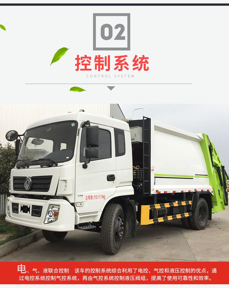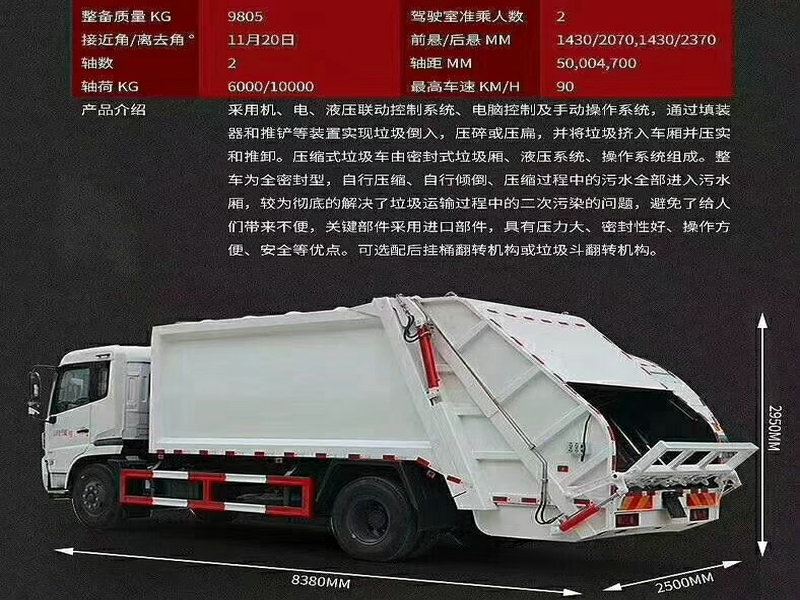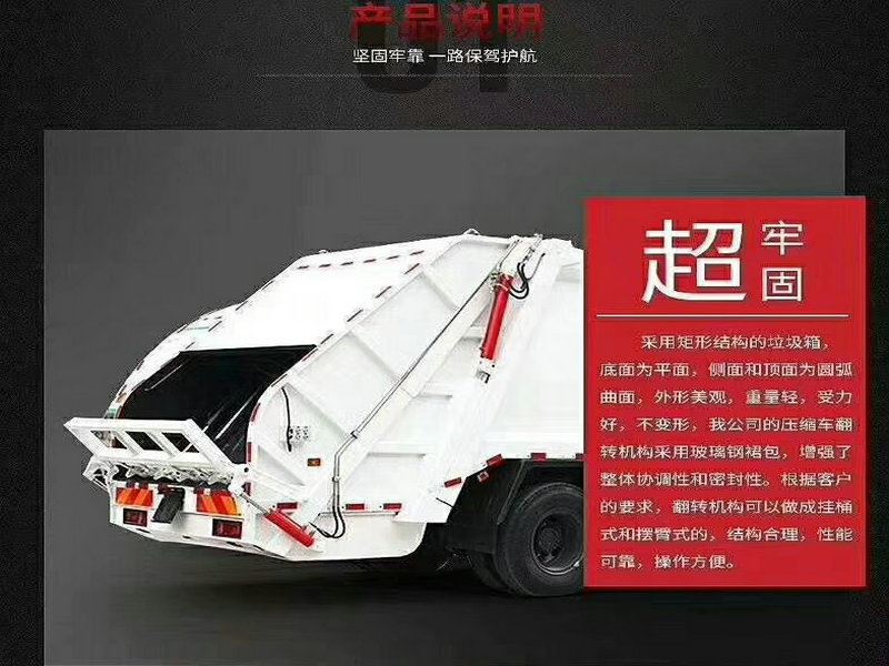 压缩式垃圾车介绍:10立方,12立方压缩式垃圾车由密封式垃圾厢、液压系统、操作系统组成。整车为全密封型,自行压缩、自行倾倒、压缩过程中的污水全部进入污水厢,较为彻底的解决了垃圾运输过程中的二次污染的问题,压缩式垃圾车关键部件采用进口部件,具有压力大、密封性好、操作方便、安全等优点。操作控制系统采用PLC微电脑智能化电控系统,实现自动装料及压缩,提高装料速度,降低人工工作强度,大大提高工作效率。