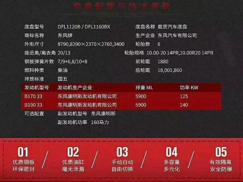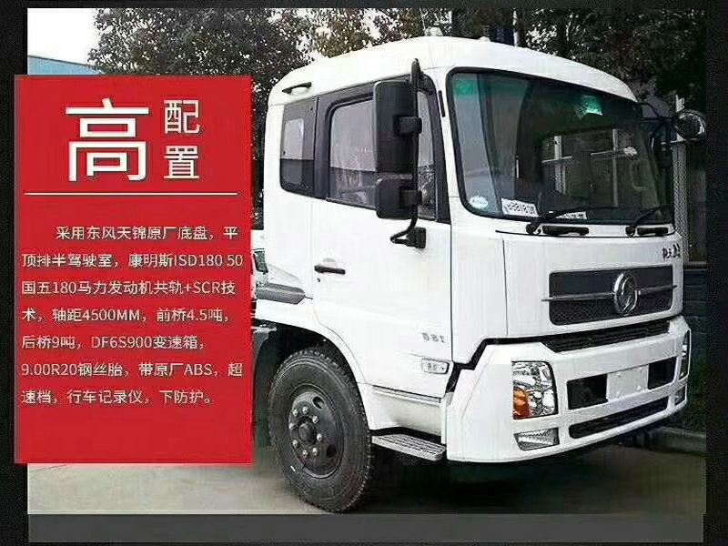 底盘采用东风天锦单排驾驶室,轴距4700mm,东风康明斯180马力或210马力6缸国伍发动机,环保公告已下发,前桥5吨,后桥10吨,10.0R20钢丝胎,陕齿8档变速箱,液压助力转向,ABS防抱死系统,断气刹,原装空调。