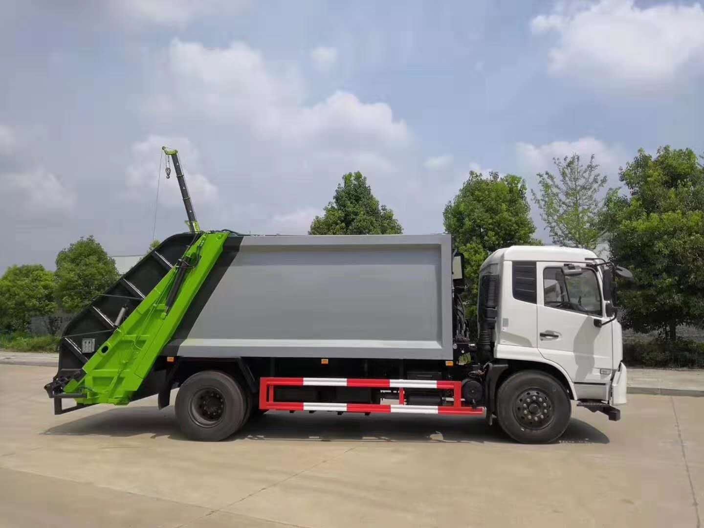 东风天锦压缩式垃圾车采用东风天锦商用车底盘,珍珠白带卧铺驾驶室,轴距4.5米/4.7米,康明斯180马力发动机(可选康明斯210马力),前桥4.5吨,后桥9吨,动力强劲,承载性能好;整车全密封型,自行压缩、自行倾倒、压缩过程中的污水全部进入污水厢,较为彻底的解决了垃圾运输过程中的二次污染的问题,避免了给人们带来不便,关键部件采用进口部件,具有压力大、密封性好、操作方便、安全等优点。 可选配后挂桶翻转机构或垃圾斗翻转机构。