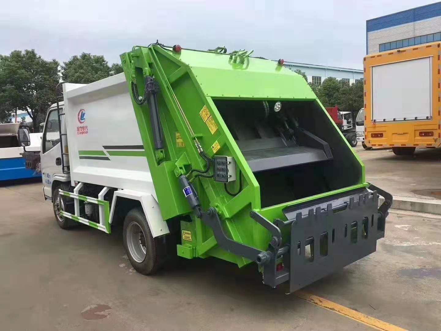 组成部分:国内知名品牌原装底盘(全国联保)、垃圾箱(密封式)、污水箱、填装器、刮板、挂桶装置、取力器、多路换向阀、液压系统、操作系统等组成。(举升油缸及锁紧油缸系我厂自行研发生产的双作用油缸。)