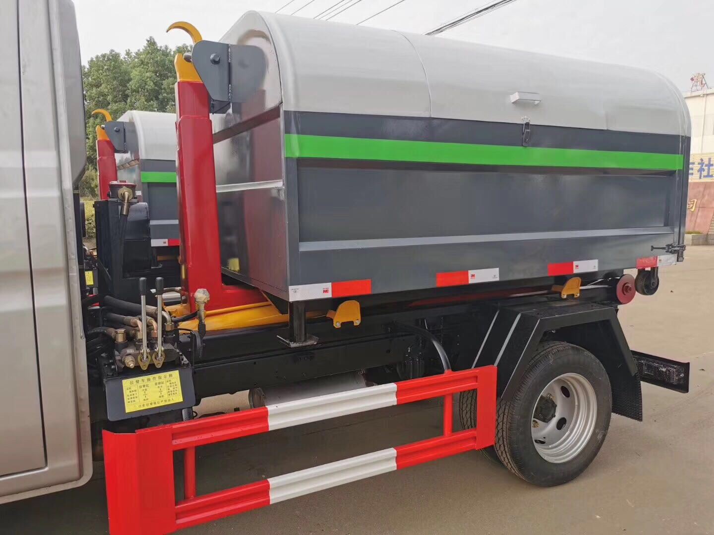 专用性能:车厢可卸式垃圾车:采用高新设计可摆动的钩臂,垃圾箱由框架、开启油缸、滑轮、后门和若干加强框架与钢板焊接而成。调换货厢快捷方便,货厢上带盖(倒垃圾时可翻开),