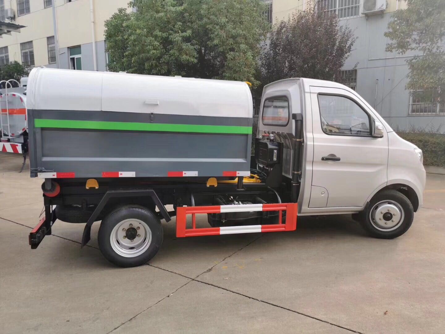 3方长安小型勾臂垃圾车选装配置:该车可选装手动加电控双操作控制,201或304级不锈钢箱体,箱体内部可做防腐。