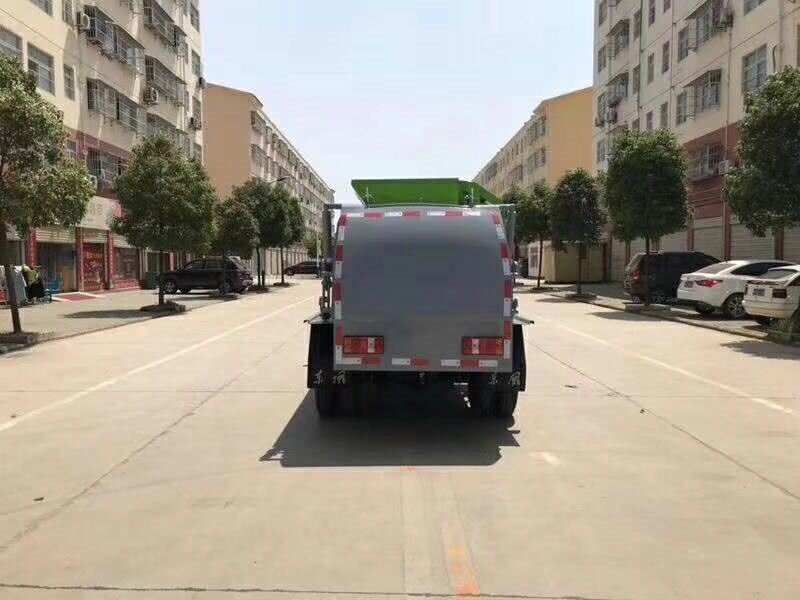 工作方式是通过尾部的填装机构将垃圾倒入厢体,然后经过厢体内的液压推板将垃圾压缩成块,等厢体装满后在指定地点打开液压尾门,再次通过液压推板将块状垃圾推出。填装机构有五种类型可选:挂桶式、摆臂式、 大落地斗式、三角斗式和无翻转机构。