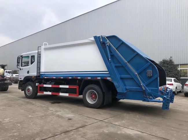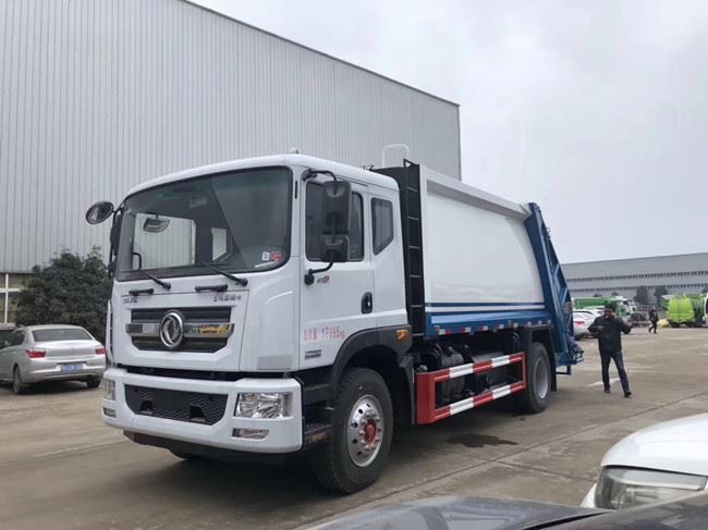 东风D9驾驶室,带空调,12方压缩垃圾车,武钢优质碳钢制作罐体,底箱及填充器采用加厚钢板,上装部分具备反复压缩和蠕动压缩功能带,手电一体操作模式,双侧控制盒,三种操作控制台,分别位于驾驶室,箱体尾部,箱体顶部。
