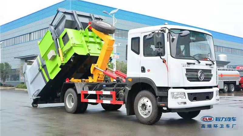 摆臂式压缩的车专用功能: 摆臂压缩的车的特点是箱与车体分开,实现一车与多个箱的联合使用,循环运输!货斗有方形和船形,方形用于地坑式,船形置于地面,充分了车辆的运输能力,特别适用于短途运输,如环卫部门对城镇的清理、运输等!为了不使装载的轻飘货物在运输中飘落,此车型可设计成结构!斗可吊上吊下,摆臂一次工作循环时间:60S! (4)、 拉臂式压缩的车专用功能: 由液压、操作组成!举升油制缸(1支)系国内知名液压件厂家生产的双作用油缸!厢可自吊上放下,可自行倾倒,上下一次工作循环时间≤50S!该车的特点是一个车能配多个厢!