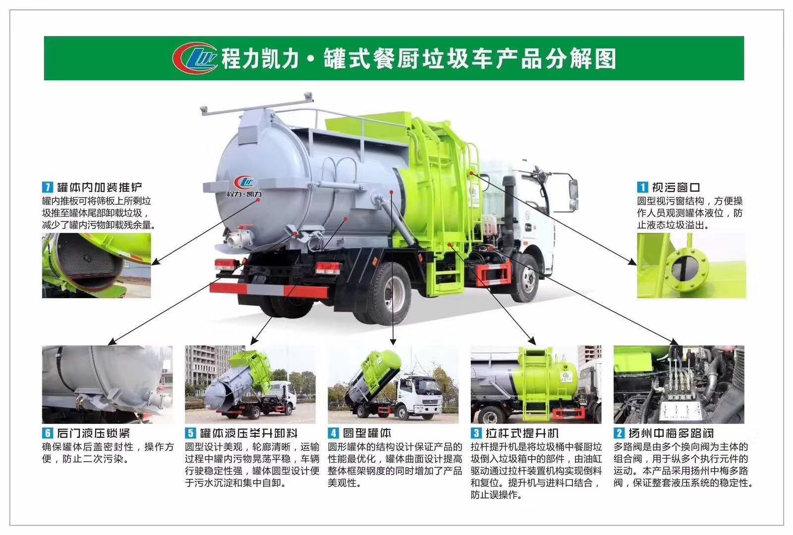 东风D9餐厨垃圾车采用的是拉杆式上料机构,对于餐馆,酒店等地方垃圾桶收运垃圾更方便快捷。直接将120L,240L垃圾桶挂在上料机构上面,采用液压提升机构自动上料和卸料