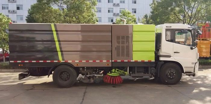 东风天锦洗扫车介绍:东风天锦洗扫车是一款集扫路车和高压清洗车功能于一体的高效环卫设备。该车采用高压力、低流量水流冲洗,并结合扫刷刷洗路面、吸嘴收集,实现了强力去污、高效节水、污物及污水回收的目的;作业时,外伸至路沿的左(右)旋转洗刷配合低压水首先对路面、路沿和路沿石立面进行一次刷洗。同时紧随其后的中置宽吸嘴中的内置长排喷杆和左右两侧的旋转喷杆的高压水,对路面、路沿及路沿石进行第二次冲洗,两侧喷杆形成的“V”型工作夹角,使清洗后的污水自动流向中置宽吸嘴,将污水汇集至吸嘴口、吸入污水箱。