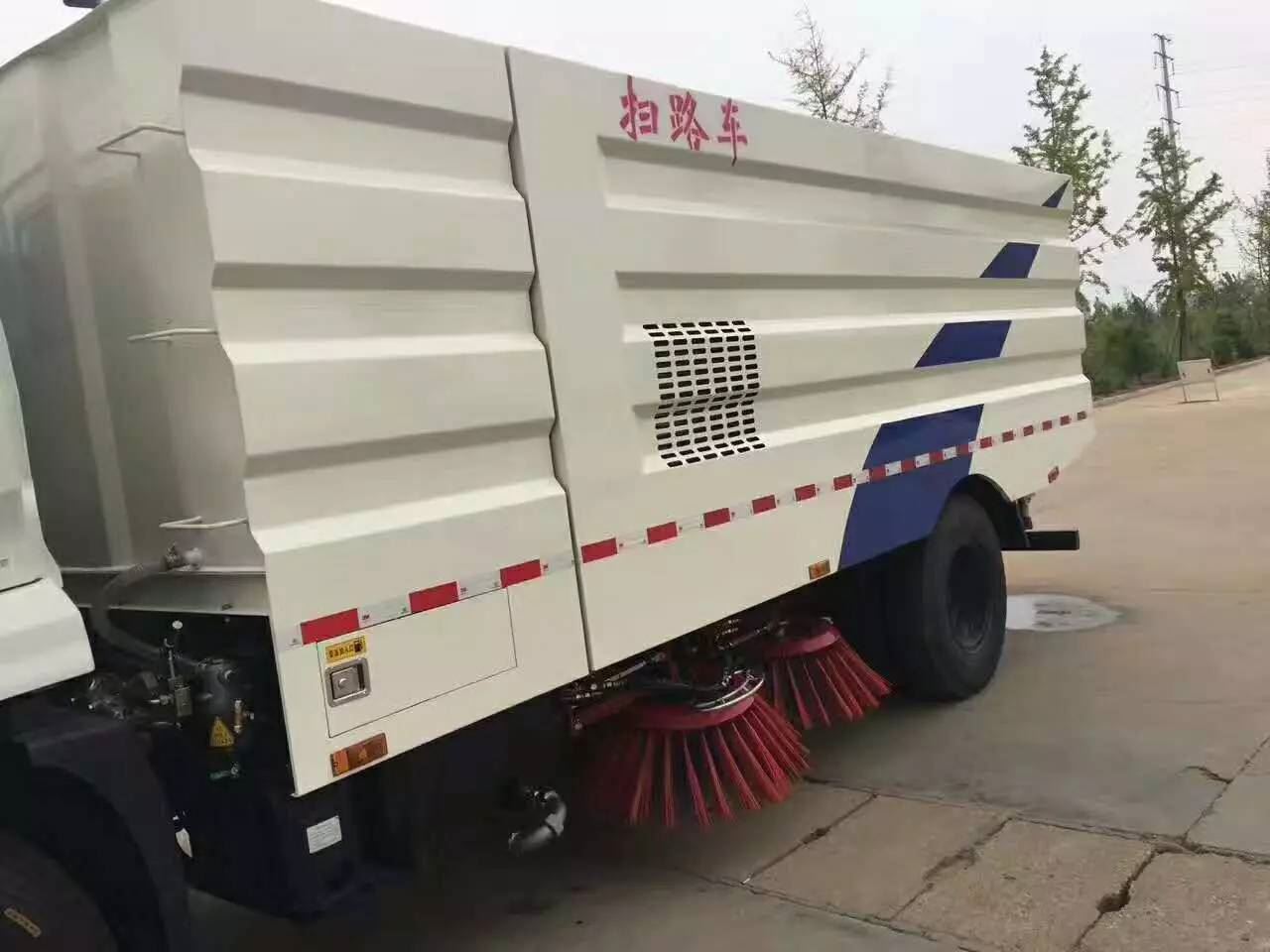 东风天锦扫路车采用吸扫结合的方式收集垃圾,湿式除尘、电液控制,液压倾翻卸料的作业方式对路面进行清扫作业。