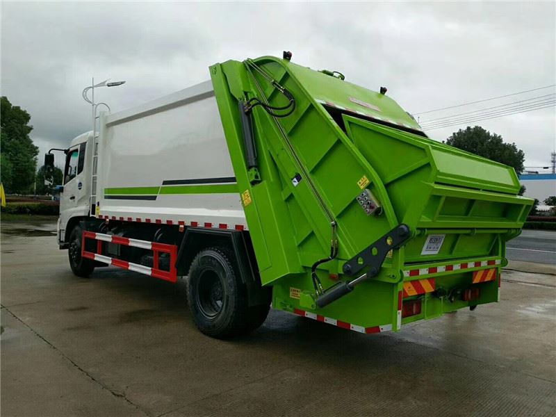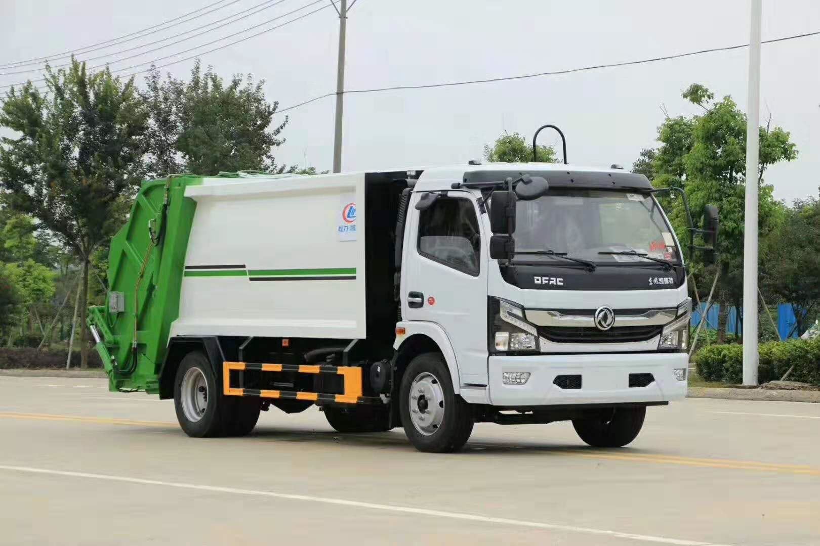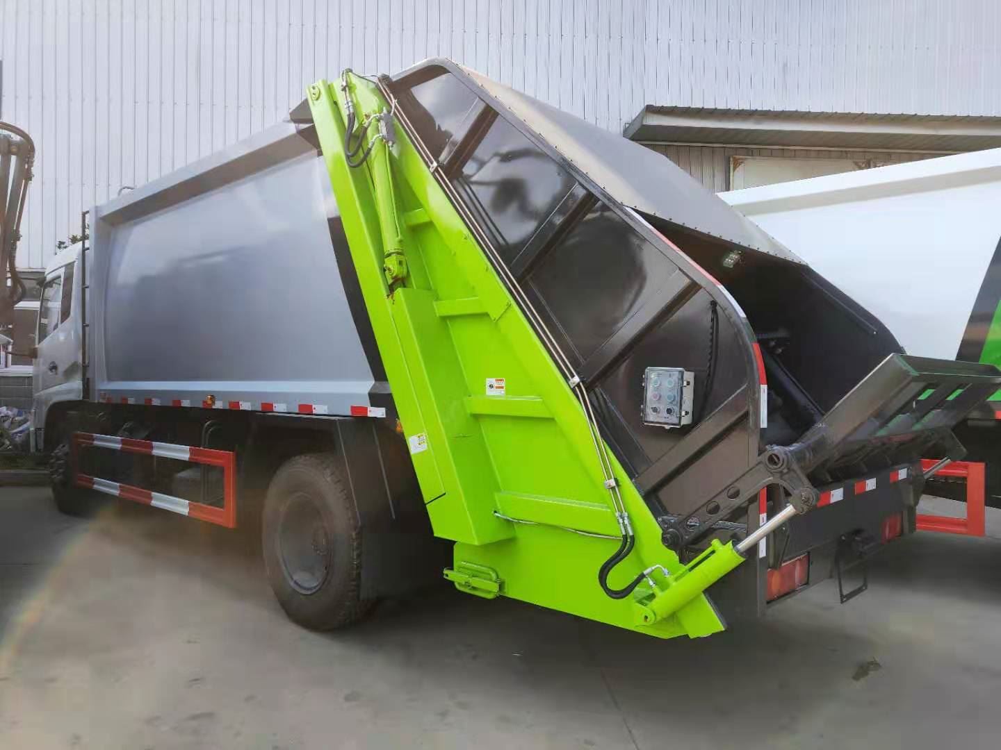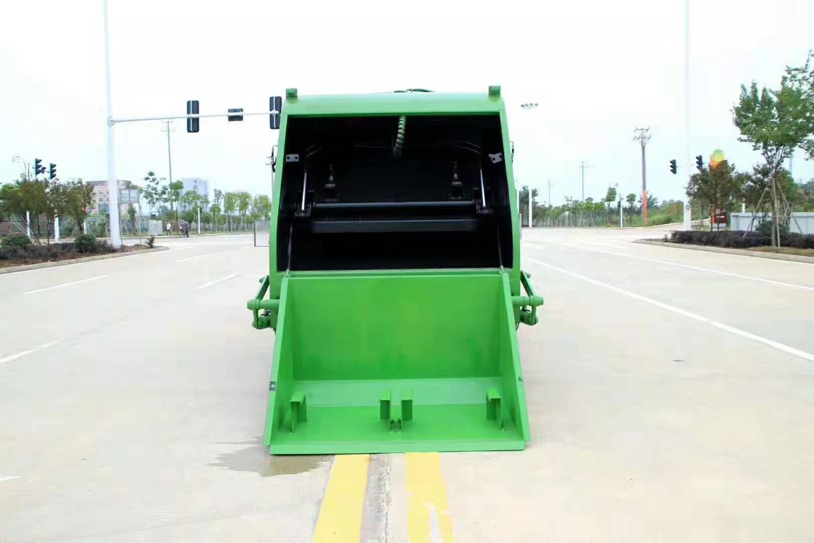 压缩垃圾车由密封式垃圾厢、液压系统、操作系统组成。整车为全密封型,自行压缩、自行倾倒、压缩过程中的污水全部进入污水厢,较为彻底的解决了垃圾运输过程中的二次污染的问题,避免了给人们带来不便,关键部件采用进口部件,具有压力大、密封性好、操作方便、安全等优点。 可选配后挂桶翻转机构或垃圾斗翻转机构。压缩式垃圾车专用部分由垃圾厢、污水箱、填装器、刮板、推铲、多路换向阀、液压系统、挂桶装置等组成。厢体材料为优质炭钢,厚度为5mm,装料机构由支架、连杆机构、凸轮、挂钩等组成,在油缸作用下,将垃圾桶内的垃圾自动翻转倒入料斗内。