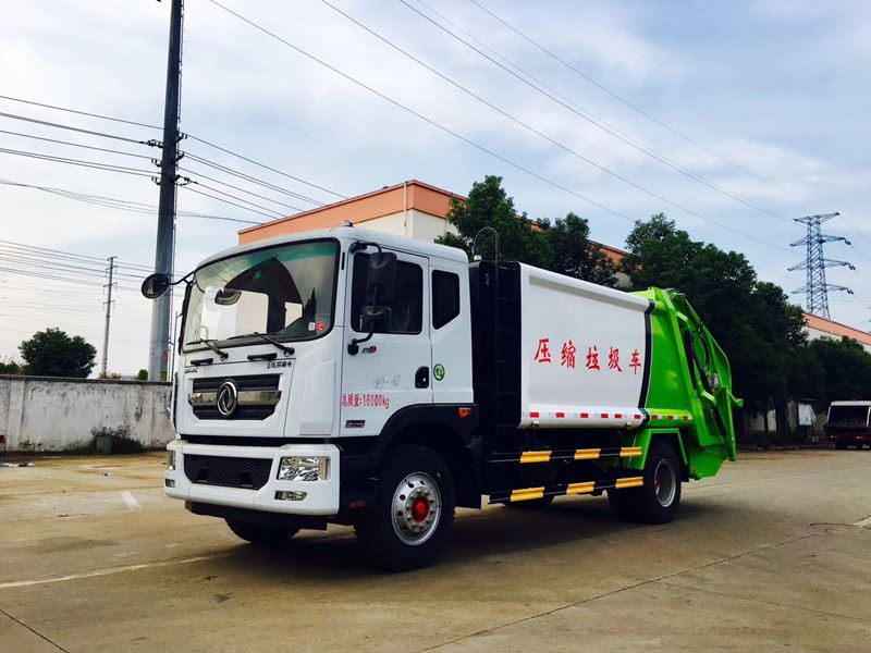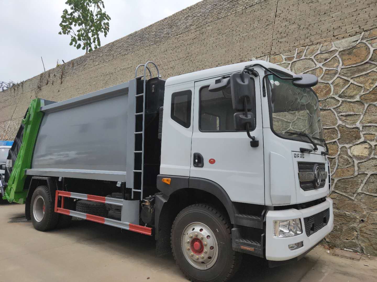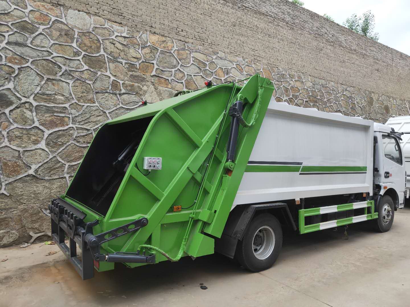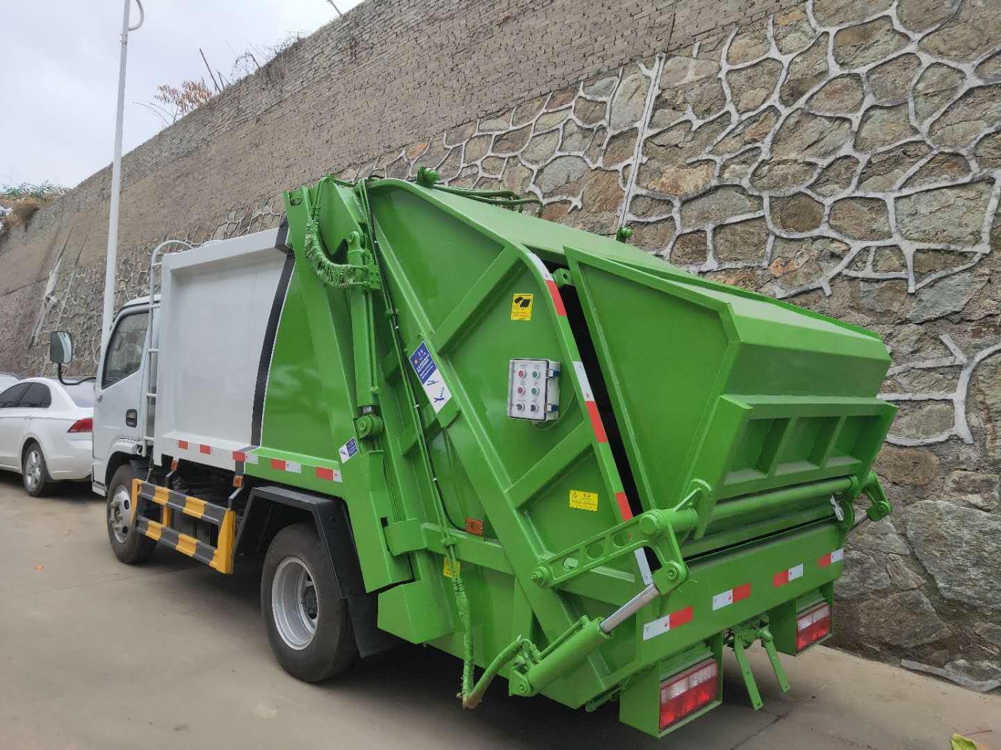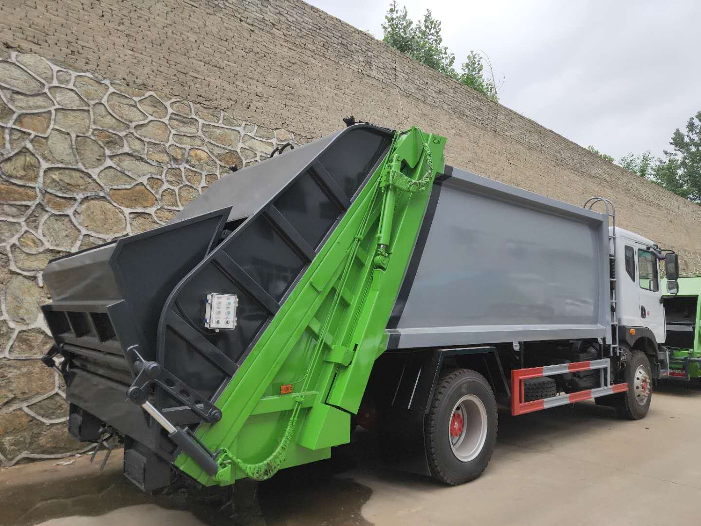 上装配置:新款平面弧形厢体,厢体材料为武钢优质碳钢,有效压缩容积10-12立方,PLC一键操作控制,手电一体操作模式,两侧双电控,带驾驶室内操作,底板支撑加强,双向压缩,开放式易清洁污水箱。压缩式垃圾车采用机电液一体化技术,借助机、电、液联合自动控制系统、电脑控制、手动操作系统,通过填装器和推铲等专用装置,实现垃圾倒入、压碎或压扁、强力装填,把垃圾挤入车厢并压实和推卸,污水全部进入污水收集箱,解决了垃圾运输过程中的二次污染的问题。压缩式垃圾车具有自动反复压缩以及蠕动压缩功能,压缩比高、密封性好、装载量大﹑操作方便、环保性好﹑整车利用功率高等优点。作业自动化,垃圾收集方式简便、高效。后翻转机构选装:1、挂塑料桶式翻转机构;2、挂铁桶式翻转机构;3、摆臂式翻转机构; 4、簸箕斗式翻转机构。