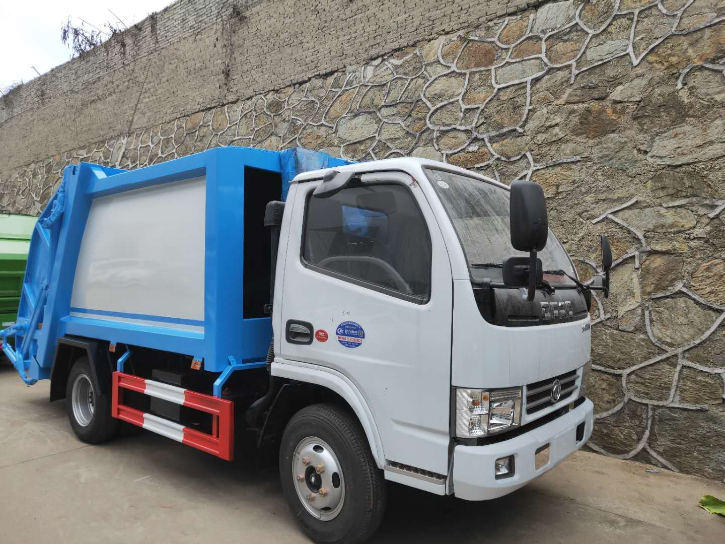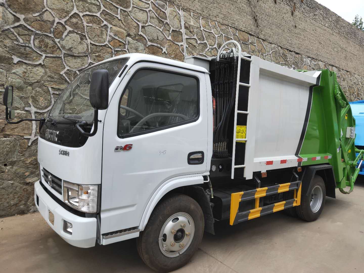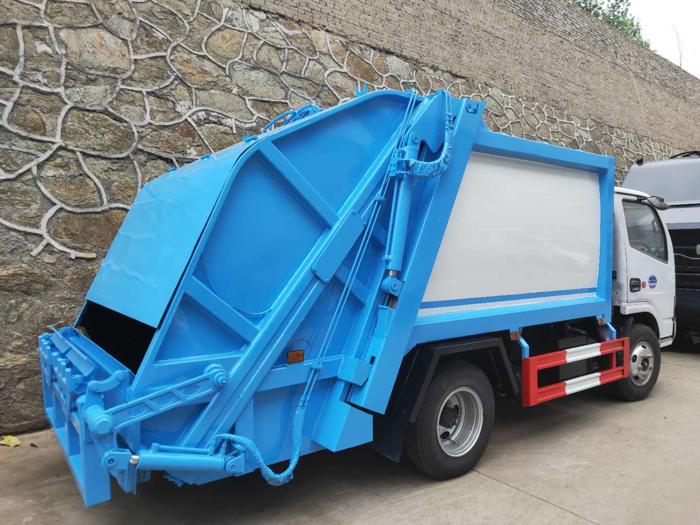 选装配置翻转斗、挂桶架、后装压缩挂桶垃圾箱: 垃圾箱体边采用3mm碳钢板,底板采用4mm碳钢板,箱体容积4.0-5.0(标准容积)方米,箱体打骨架加强,后推板式垃圾箱(选择安装挂桶翻转机构或垃圾斗翻转机构);