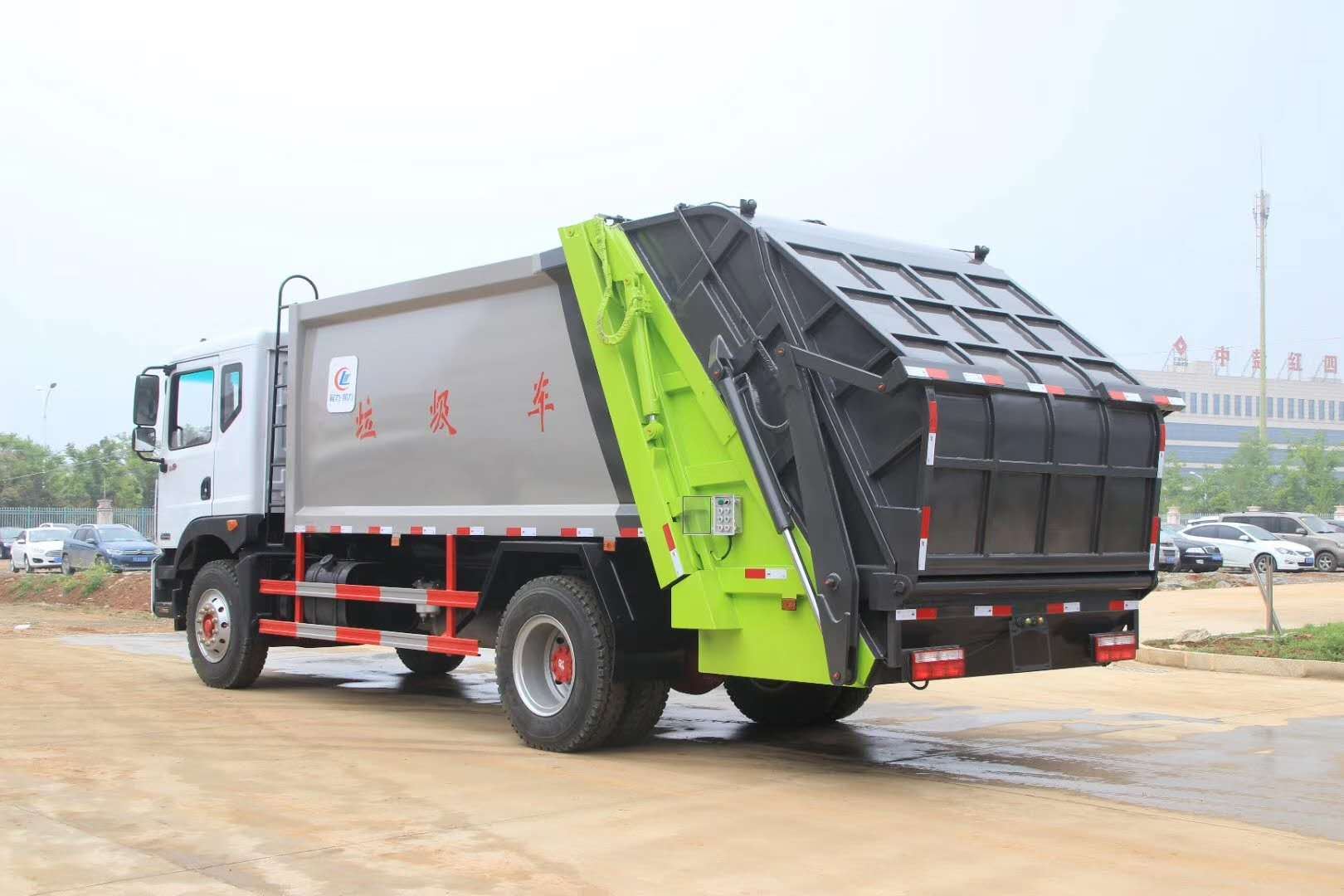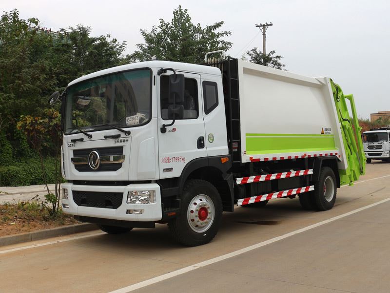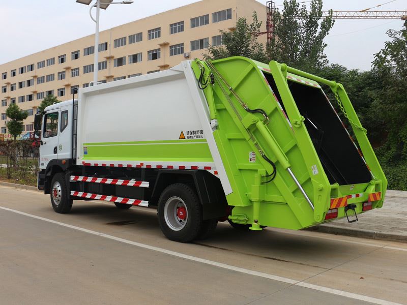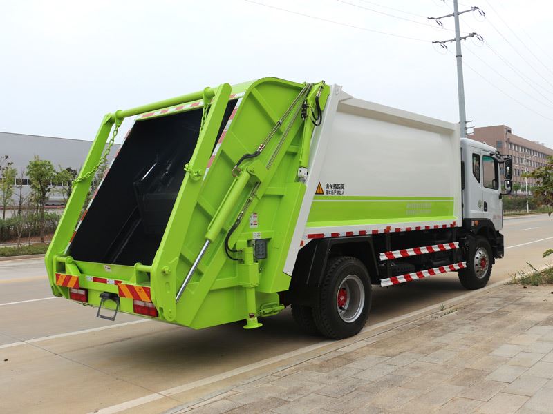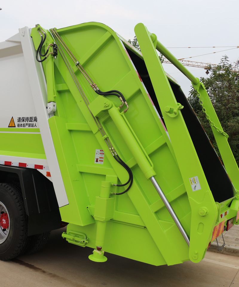 压缩式垃圾车,东风多利卡D9压缩式垃圾车,垃圾车箱有效容积8-10立方米,弧形车厢,材料采用边3底4mm厚,9支液压油缸,液压控制操作系统为电动控制和手动控制,手动控制是防止电控发生故障时也能够正常工作,装载循环为一键操作,车尾左右各一套,驾驶室内部一套电动卸料操作系统,填充器翻转机构可选:挂桶式、垃圾斗式、摆臂式,填充器底部带污水收集箱,车箱内的污水可流入其中,在卸垃圾时可通过球阀排出,尾部加装工作照明灯,其余为厂家标配。