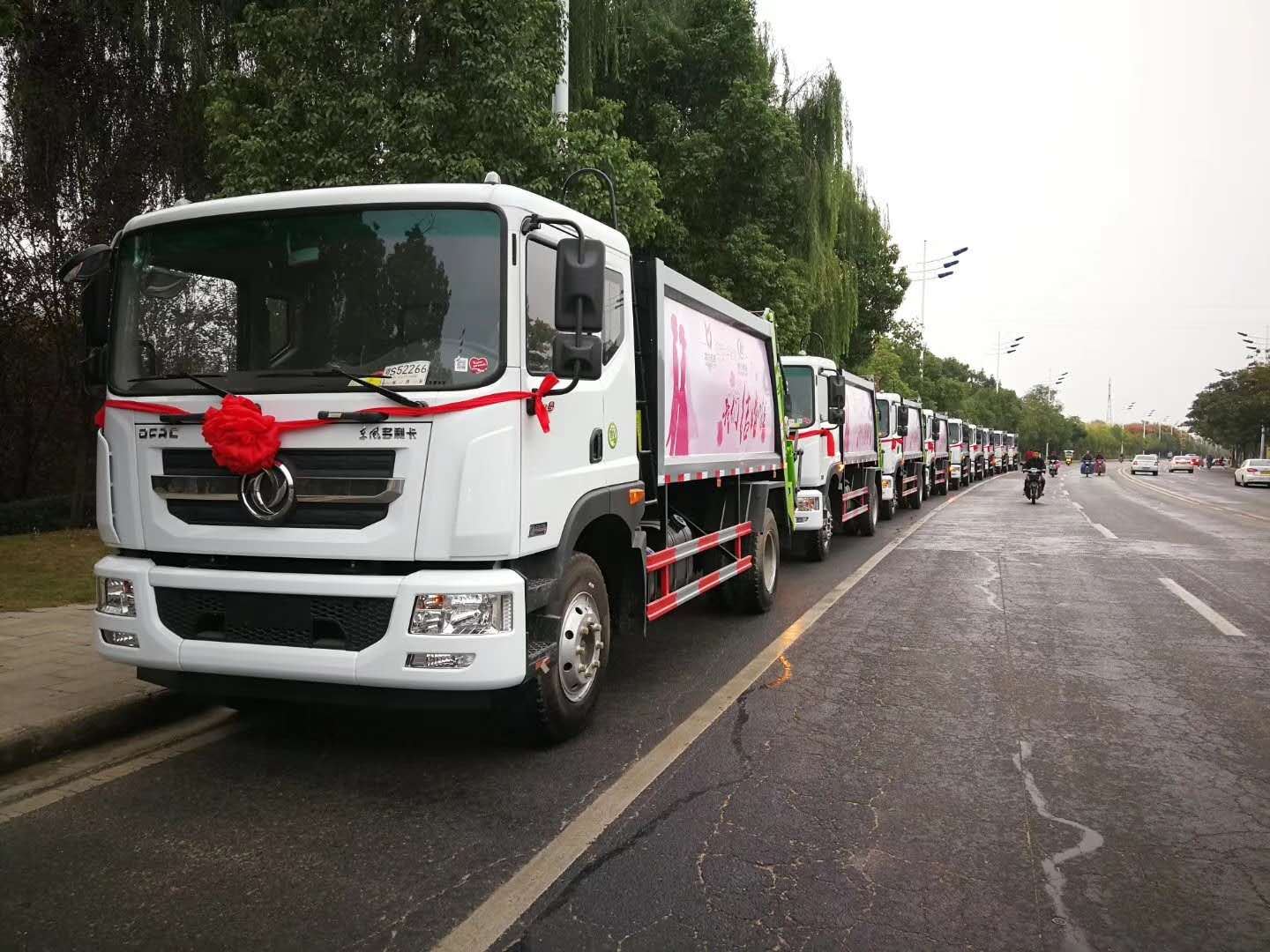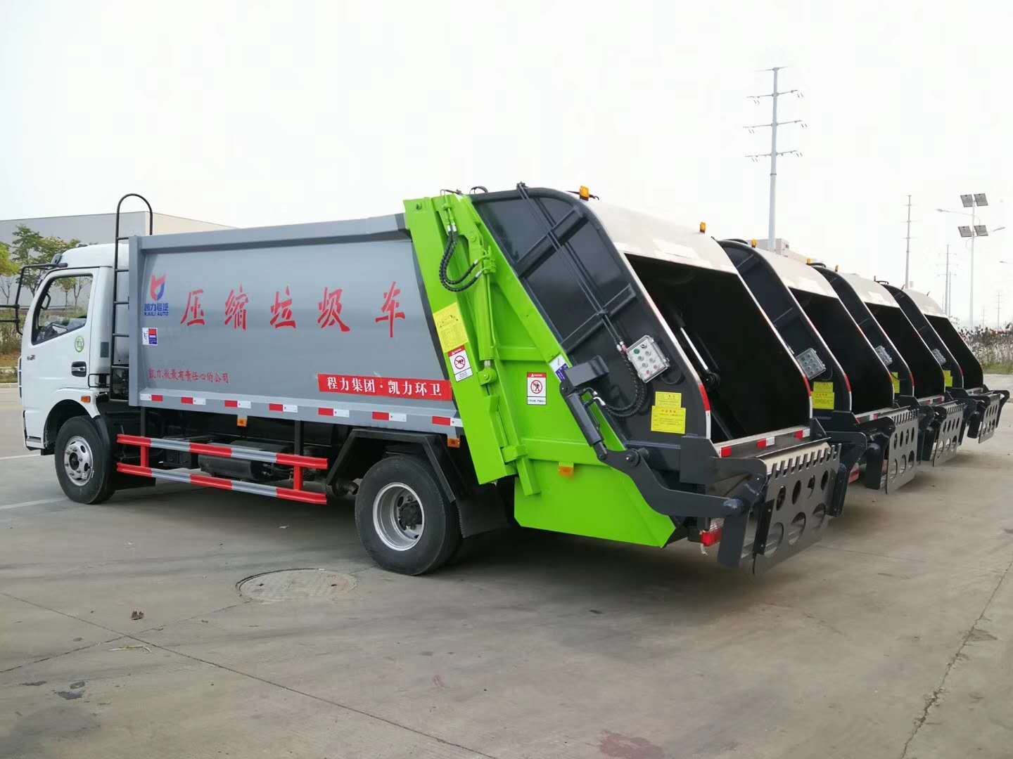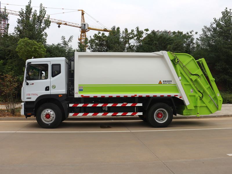 压缩式垃圾车,东风多利卡D9压缩式垃圾车,垃圾车箱有效容积8-10立方米,弧形车厢,材料采用边3底4mm厚,9支液压油缸,液压控制操作系统为电动控制和手动控制,手动控制是防止电控发生故障时也能够正常工作,装载循环为一键操作,车尾左右各一套,驾驶室内部一套电动卸料操作系统,填充器翻转机构可选:挂桶式、垃圾斗式、摆臂式,填充器底部带污水收集箱,车箱内的污水可流入其中,在卸垃圾时可通过球阀排出,尾部加装工作照明灯,其余为厂家标配。