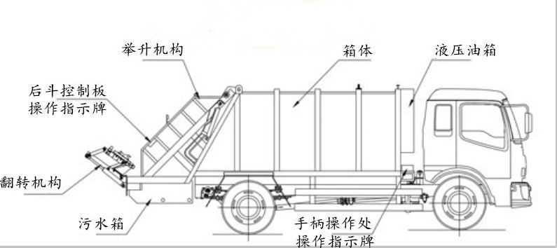 ★工作原理 压缩式垃圾车采用机电液一体化技术,借助机、电、液联合自动控制系统、电脑控制、手动操作系统,通过填装器和推铲等专用装置,实现垃圾倒入、压碎或压扁、强力装填,把垃圾挤入车厢并压实和推卸,污水全部进入污水厢,解决了垃圾运输过程中的二次污染的问题。压缩式垃圾车具有自动反复压缩以及蠕动压缩功能,压缩比高、密封性好、装载量大﹑操作方便、环保性好﹑整车利用功率高等优点。 ★结构简图