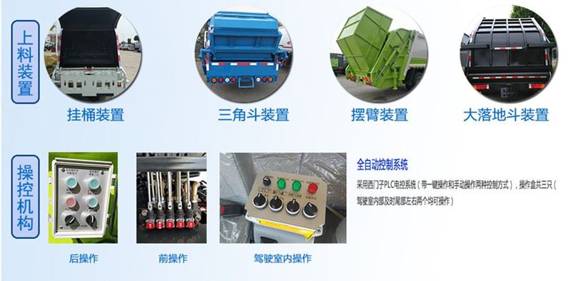 经济性好:设备工作时,电脑控制系统自动控制油门。双保险系统:系统具有电脑控制和手动操纵双重功能,大大地保障和提高车辆的使用率。翻转机构:装配置带垃圾筒(或斗)的翻转机构。朝柴102马力,3308轴距,标配华夏多路阀,恒力油缸,长源油泵,室内外标配PLC,左右外部操作系统边3底4