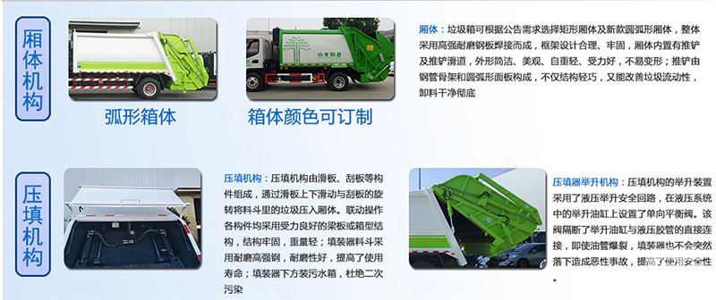 东风多利卡压缩式垃圾车 ,压缩式垃圾车突出特点:垃圾收集方式简便:一改城市满街摆放垃圾筒的脏乱旧貌,杜绝二次污染。压缩比高、装载量大:破碎压力达12吨,装载量相当于同吨级排非压缩垃圾的两倍半。作业自动化:采用进口电脑控制系统,全部填装排卸作业中需司机一人操作,不仅减轻环卫工人的劳动强度,而且大大改善了工作环境。