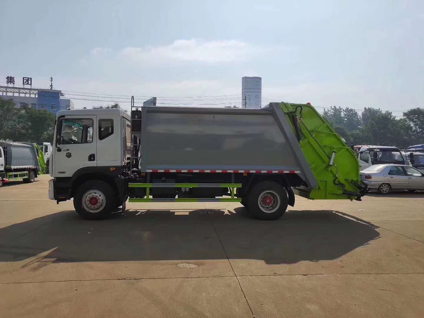 上装配置:新款平面弧形厢体,厢体材料为武钢优质碳钢,有效压缩容积10-12立方,PLC一键操作控制,手电一体操作模式,两侧双电控,带驾驶室内操作,底板支撑加强,双向压缩,开放式易清洁污水箱。压缩式垃圾车采用机电液一体化技术,借助机、电、液联合自动控制系统、电脑控制、手动操作系统,通过填装器和推铲等专用装置,实现垃圾倒入、压碎或压扁、强力装填,把垃圾挤入车厢并压实和推卸,污水全部进入污水收集箱,解决了垃圾运输过程中的二次污染的问题。压缩式垃圾车具有自动反复压缩以及蠕动压缩功能,压缩比高、密封性好、装载量大﹑操作方便、环保性好﹑整车利用功率高等优点。作业自动化,垃圾收集方式简便、高效。