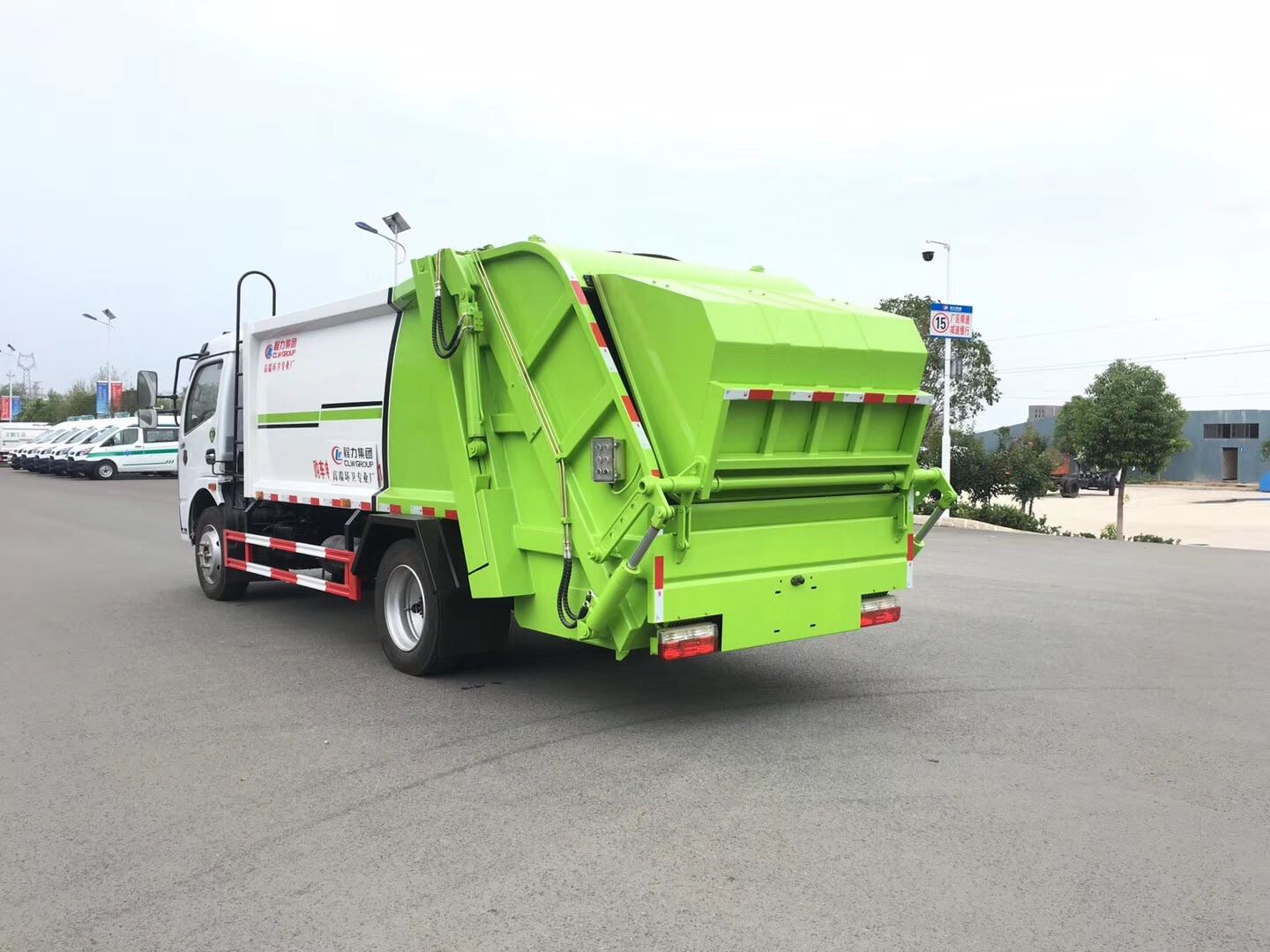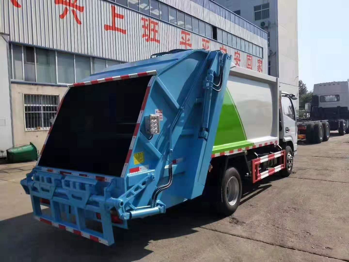 上装配置:新款无筋条箱体,平面圆弧美观大方 ,有效压缩容积为5立方 ,尾部带翻转上料机构,电控手控双操作器,驾驶室与尾部双控制箱,尾部带3cm厚橡胶密封压条,带污水收集箱。尾部填装机构有5种样式可选:摆臂式翻转架、挂桶式翻转机构、大落地斗、三角斗、无翻转机构。