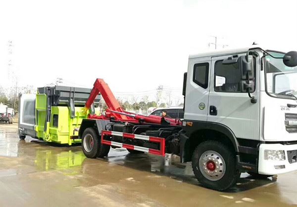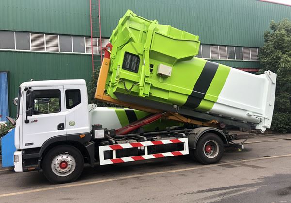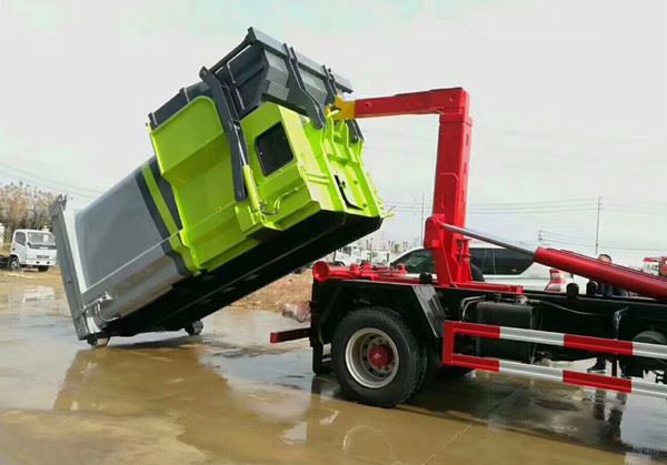 车厢可卸式垃圾车采用全封闭式垃圾箱,并可被吊装和卸离底盘。具有结构简单,操纵方便灵活,安全可靠,机械化程度高等特点,因而使其具有较高的工作效率,同时可防止误操作,避免事故发生,并可节省人力,减轻工作人员的劳动强度。由于它的特殊结构型式和工作方式,使其在装车和运输过程中能有效地避免二次污染及噪声污染,对于保护环境极为有利,是一种新型垃圾收集和运输车。