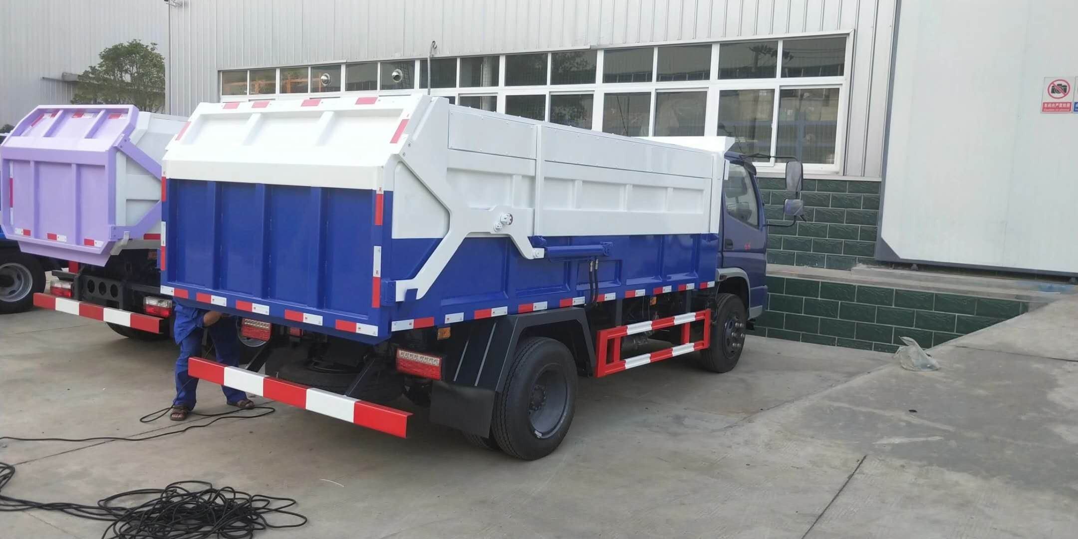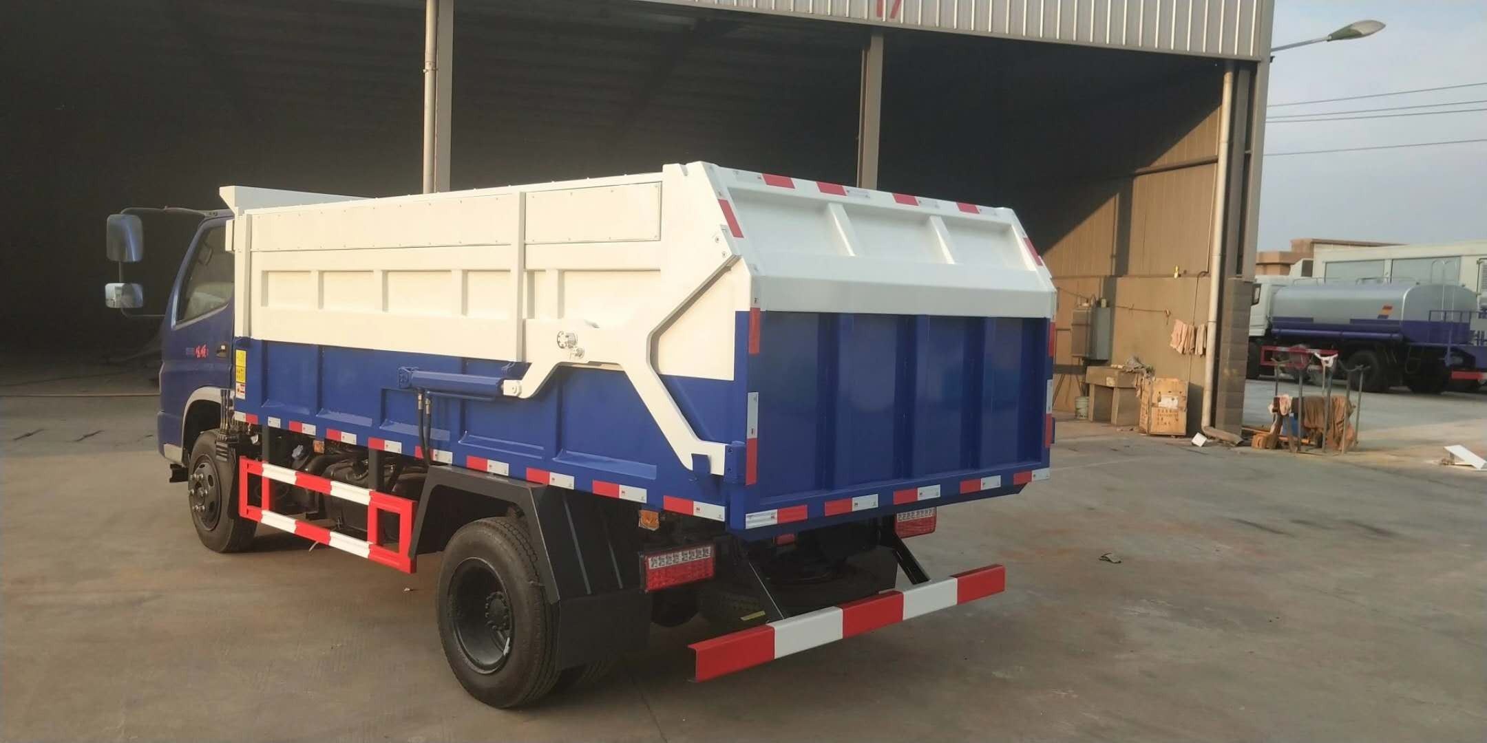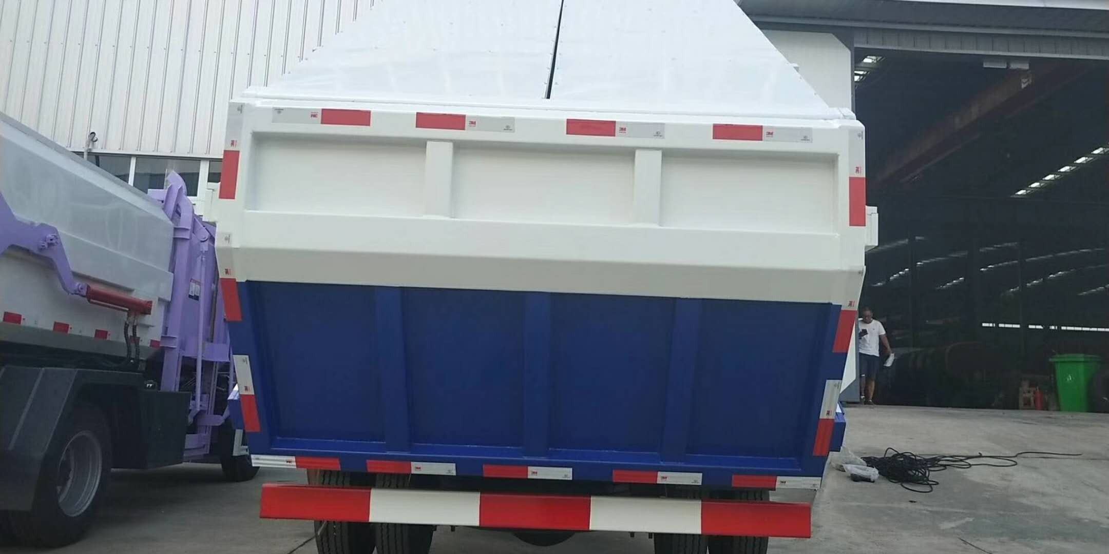 上装采用材质优质武钢板材,边3mm,底4mm,厢体容积5个立方,液压举升自卸,拉杆式提升机构,可挂240L和120L 塑料垃圾桶。