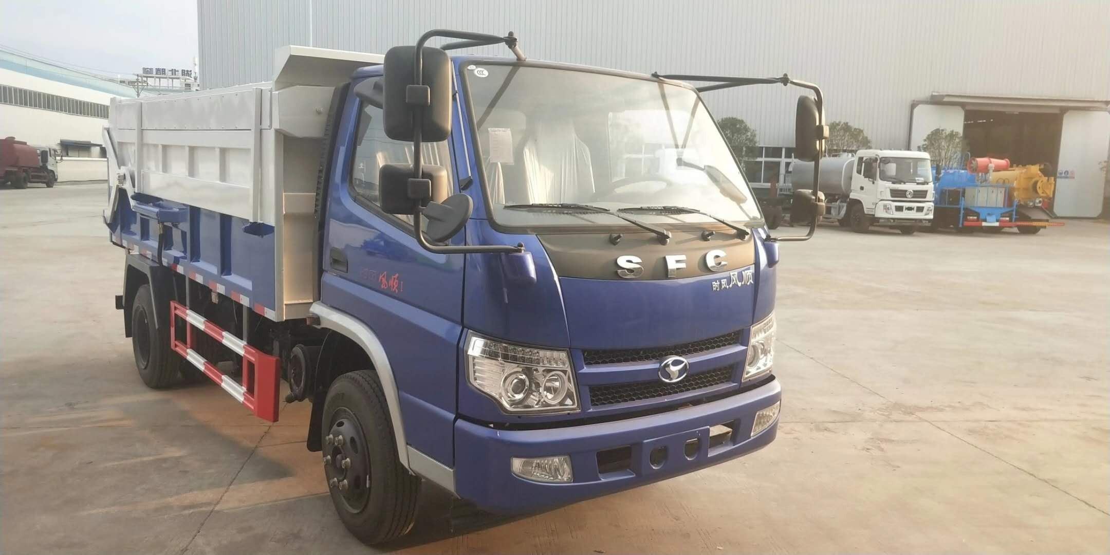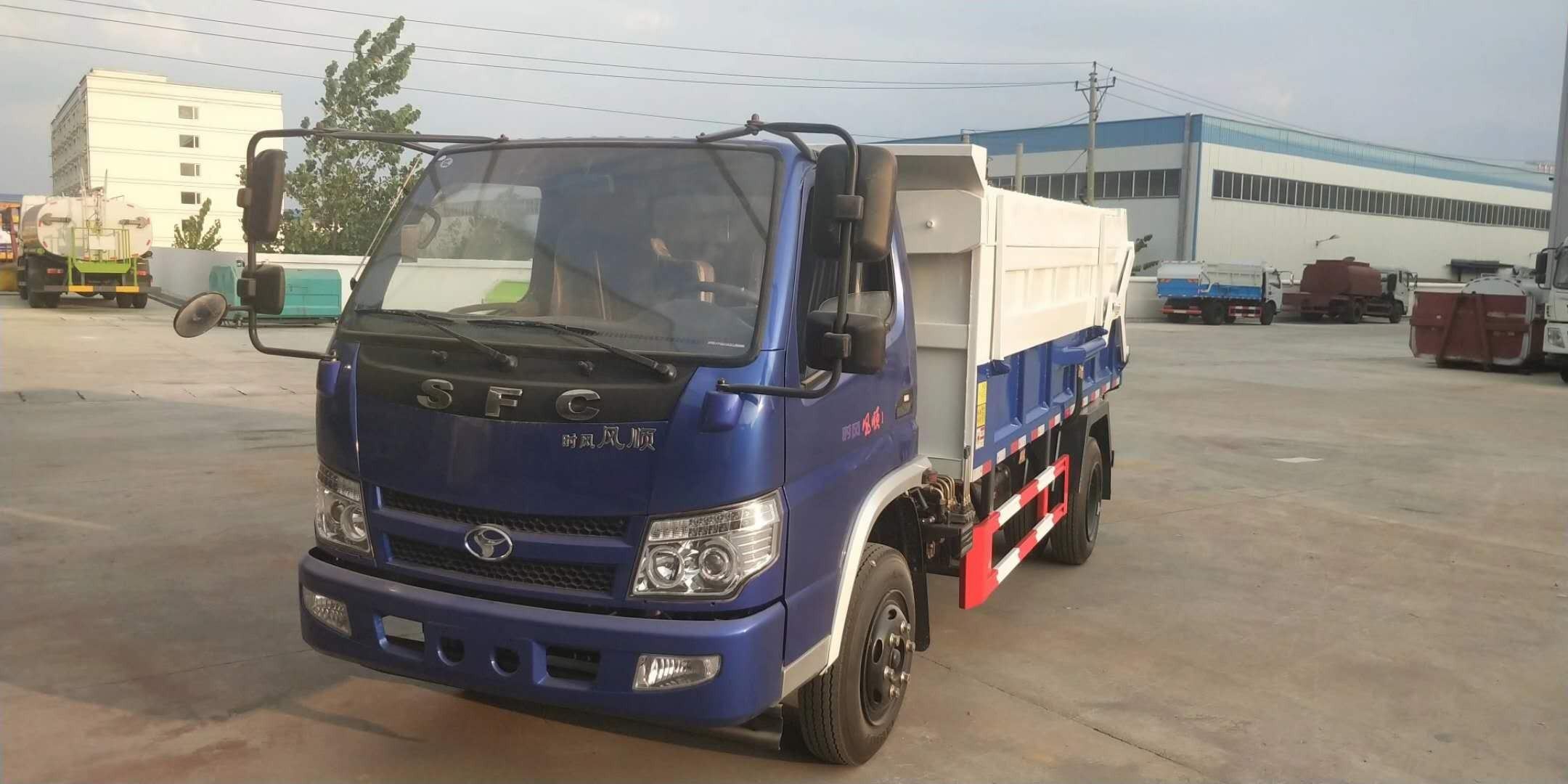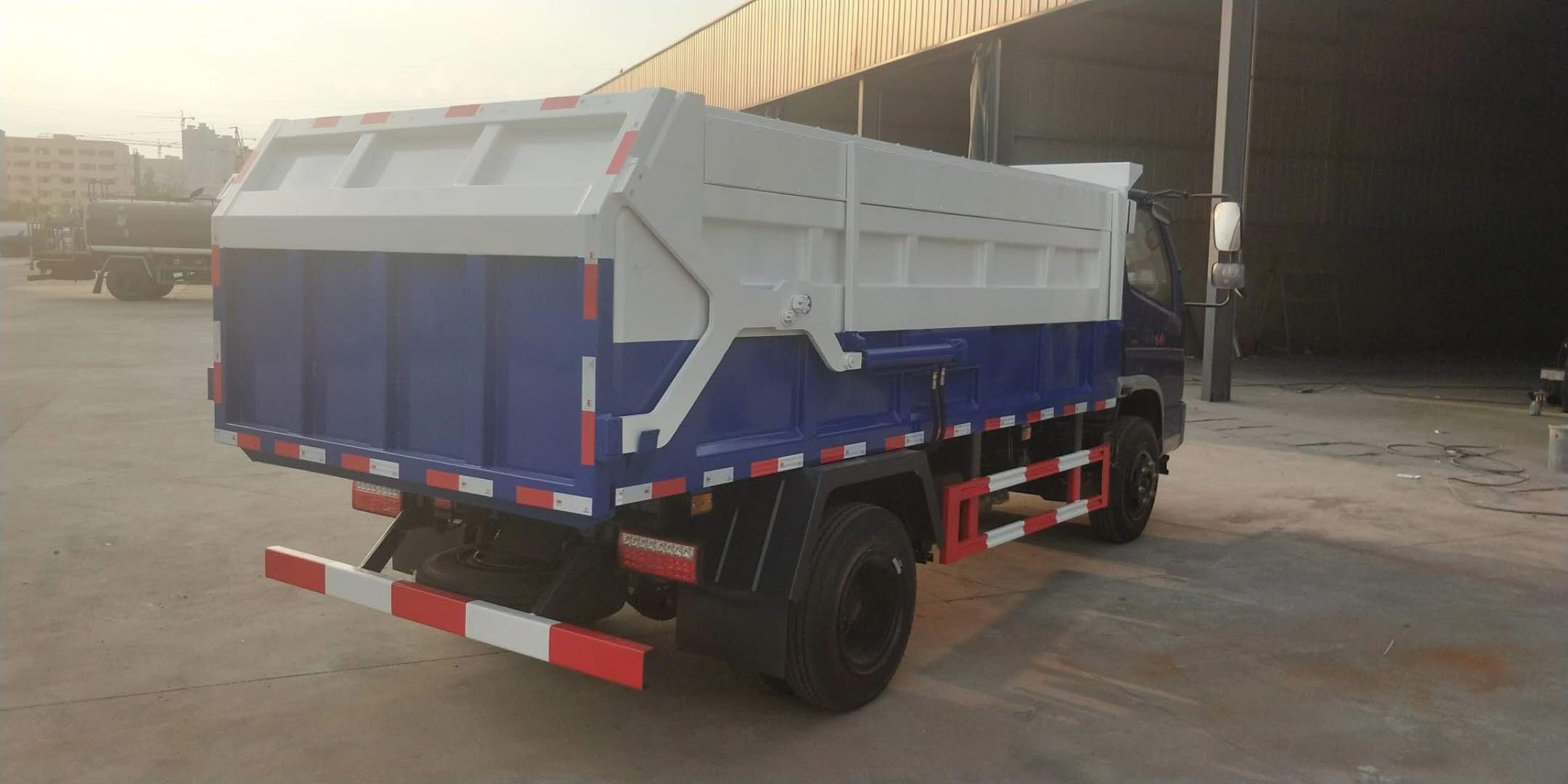 上装采用材质优质武钢板材,边3mm,底4mm,厢体容积5个立方,液压举升自卸,拉杆式提升机构,可挂240L和120L 塑料垃圾桶。