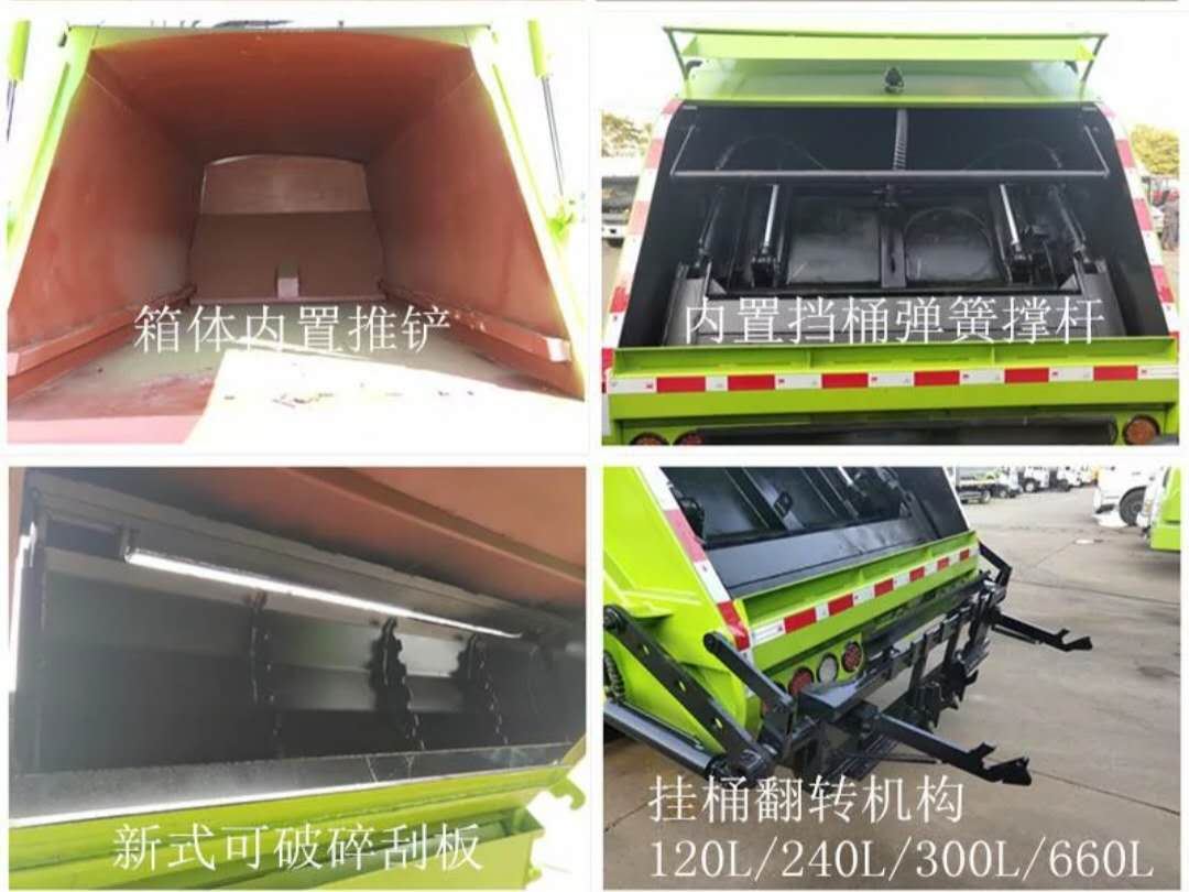 尾部选装翻桶机构,可同时翻三个国标240升方形塑料桶,带夜间工作照明灯,方便司机师傅夜间工作,可选装带报警器的液压油过滤器,可选装气动密封盖,可选装遥控器操作