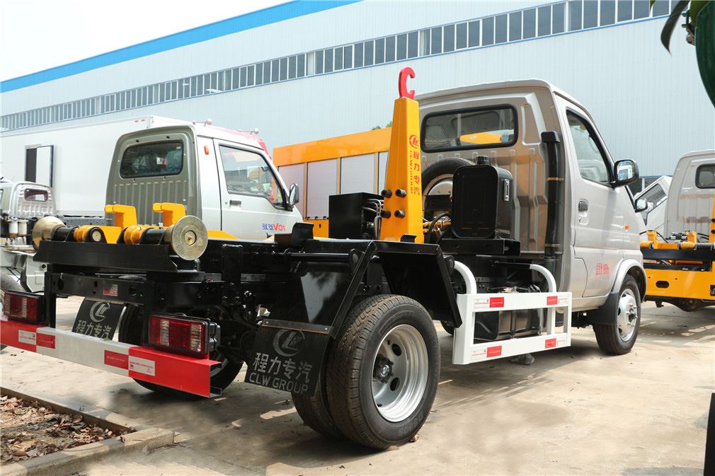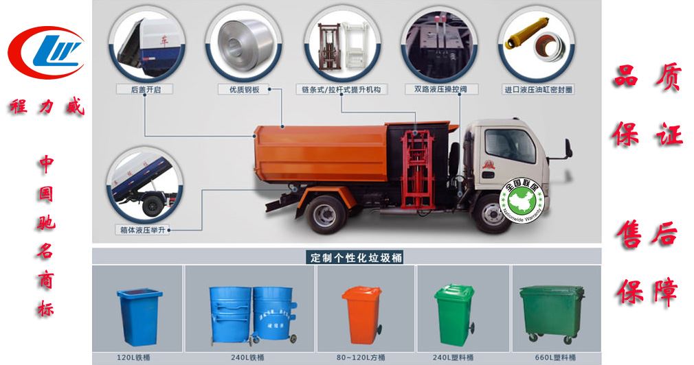 程力原厂勾臂机构,气动取力器开关,加强型勾臂结构,承载性更强。液压缸采用程力原厂生产,寿命长,售后有保障,无需要维护。箱体底部的滚轮一次浇铸而成,强度高不易损坏。通过液压机构可以完成箱内垃圾的自卸,方便可靠。